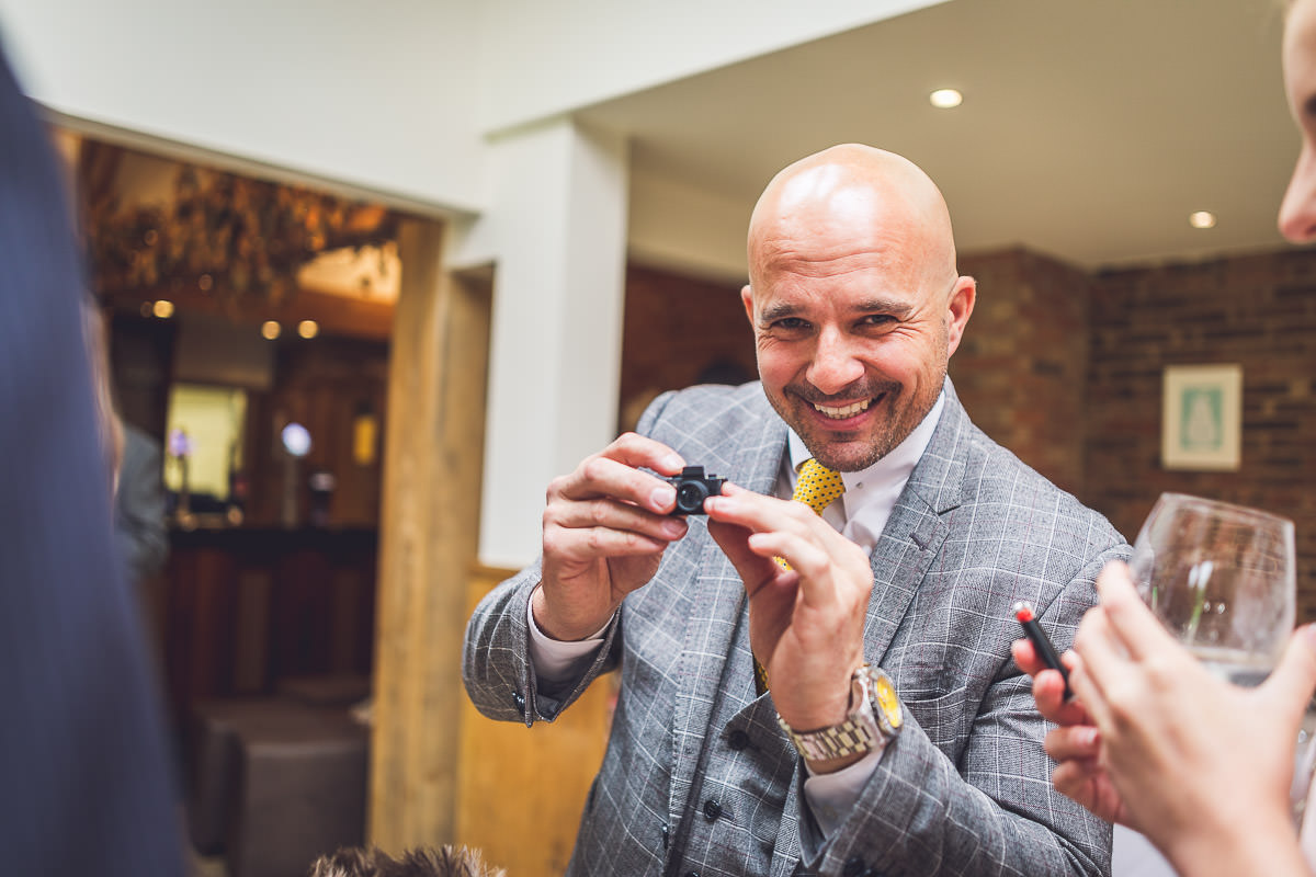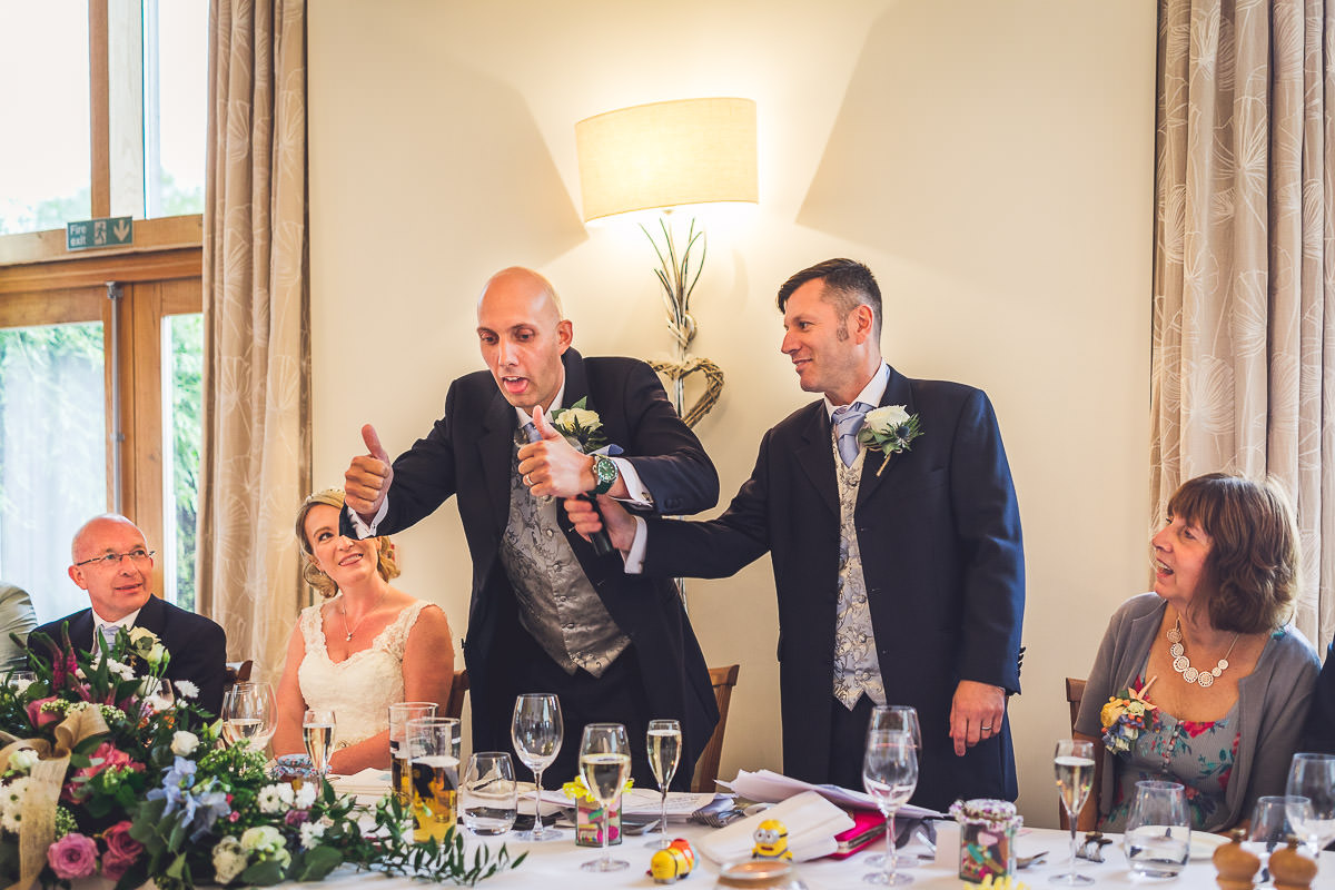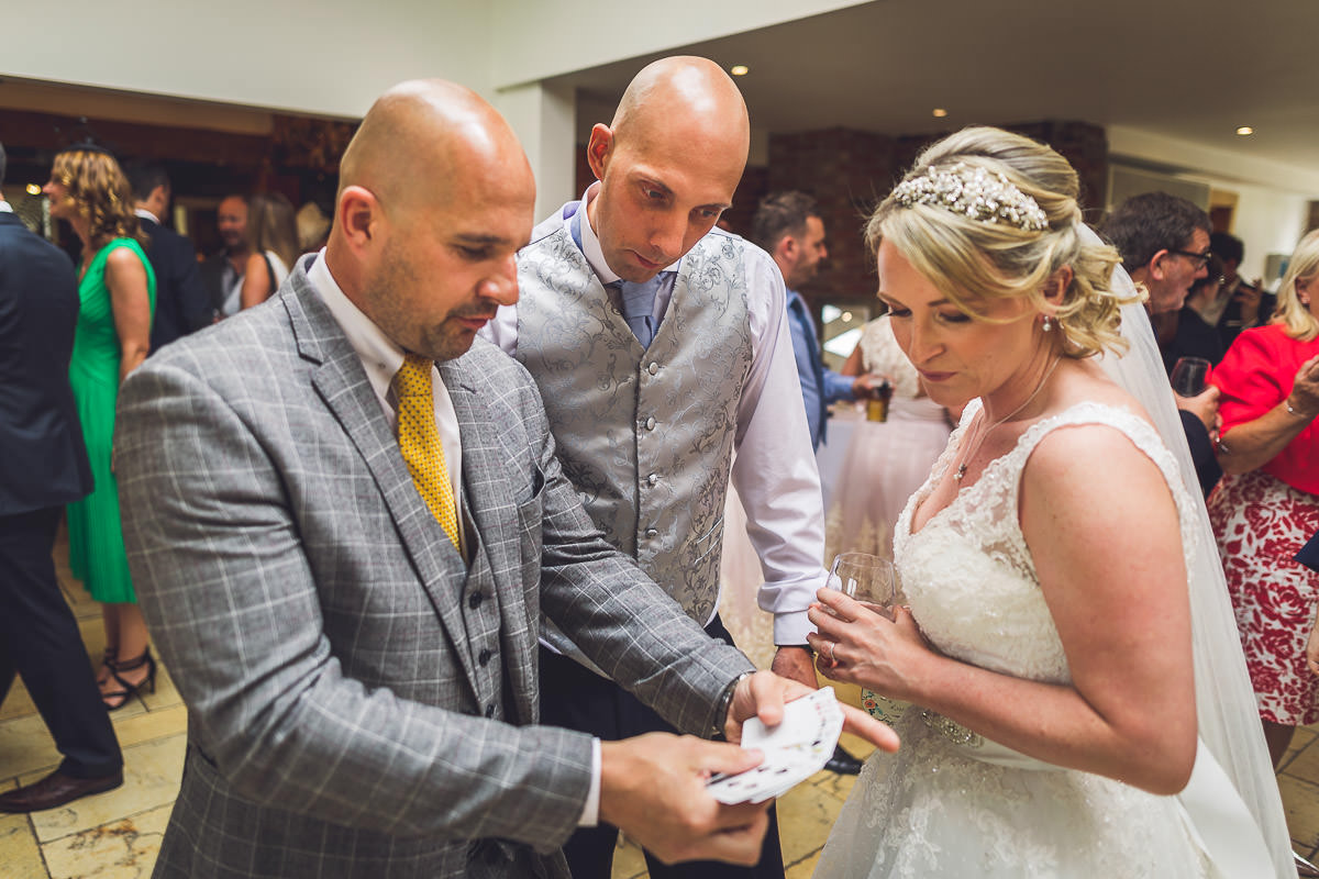The wedding ceremony took place in Mythe Barn’s Oak Barn. Lucy wore a stunning Charlotte Balbier wedding dress which was from The Bridal Rooms in Swinfen along with a tiara and veil which was from Rachel Ash in Atherstone. Doug and his groomsmen wore matching deep blue two piece suits and grey waistcoats. After the formalities had been completed everyone headed out into the Cart Barn for the drinks reception which was accompanied by some exceedingly scrummy canapes. Throughout the afternoon the guests were entertained by the amazing Gavin Parsons who mesmerised everyone with a series of close up, mind bending magic.