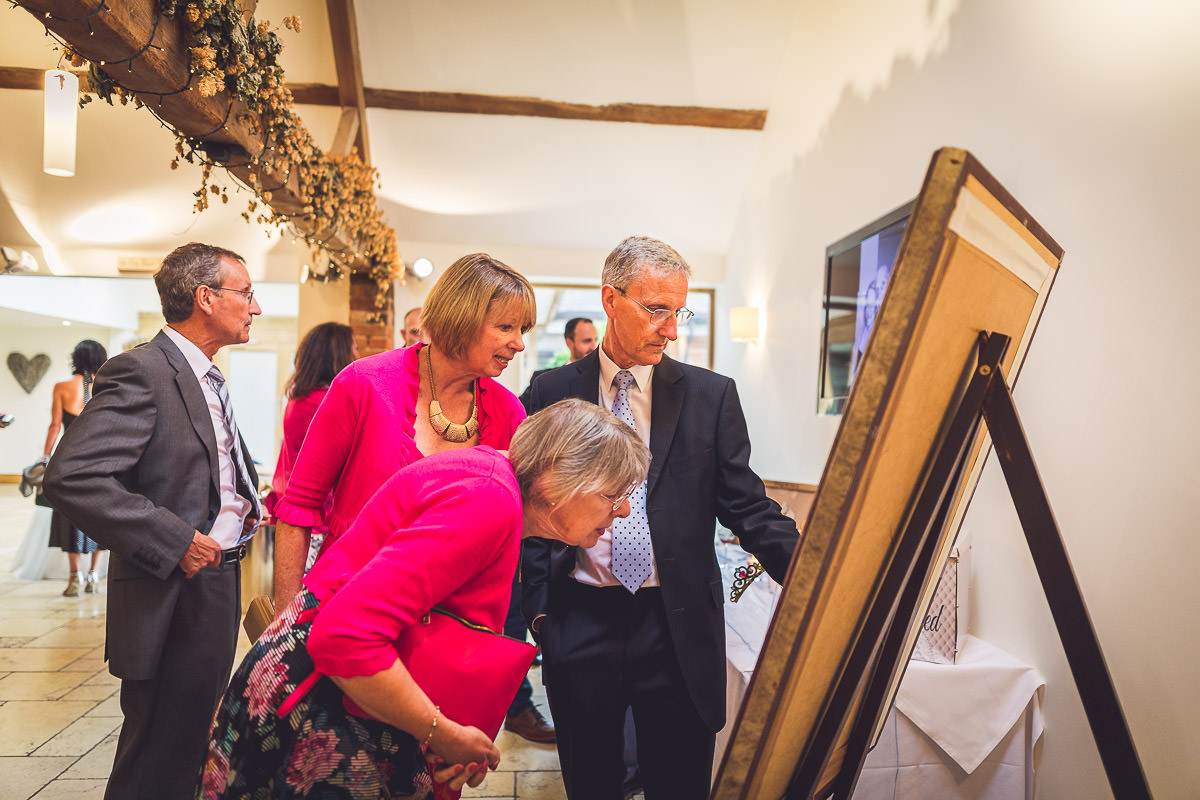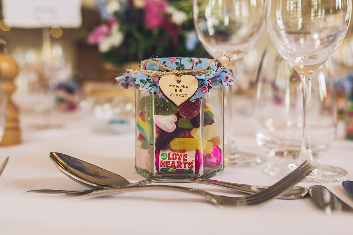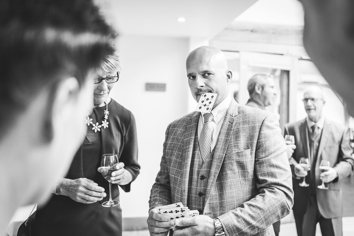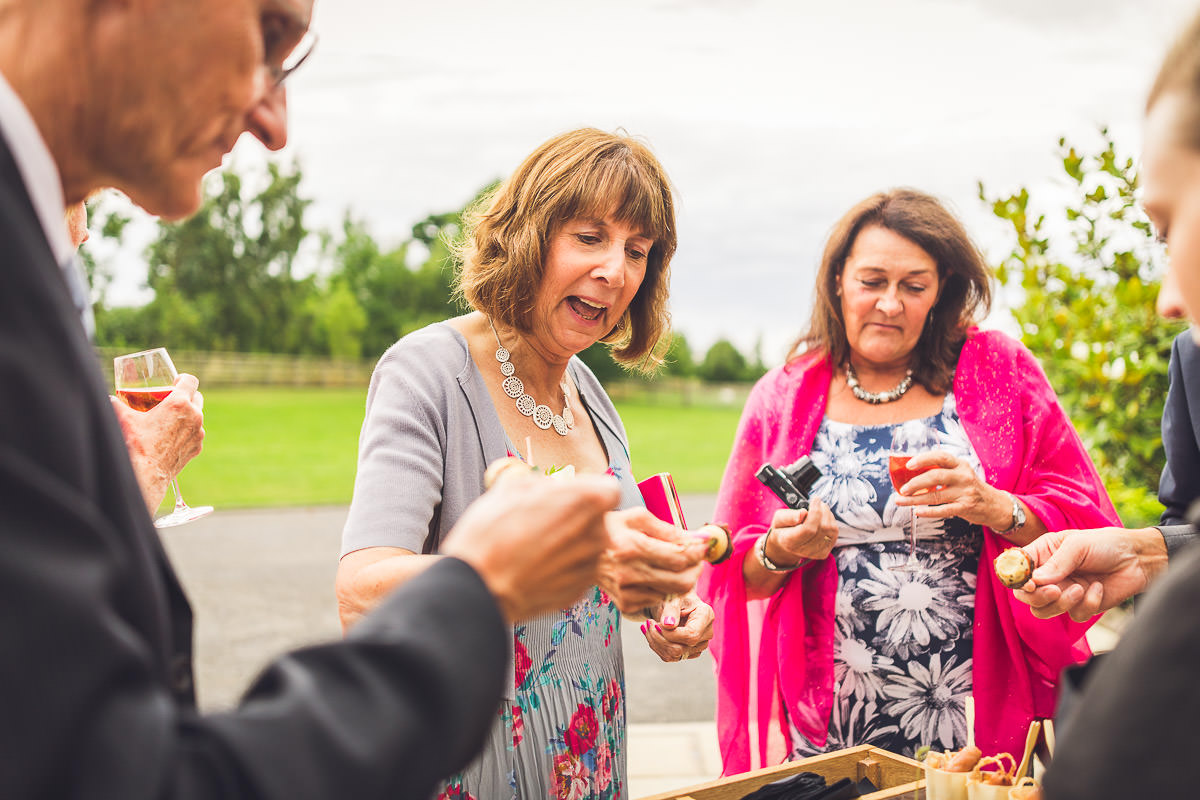 The wedding ceremony took place in Mythe Barn’s Oak Barn. Lucy wore a stunning Charlotte Balbier wedding dress which was from The Bridal Rooms in Swinfen along with a tiara and veil which was from Rachel Ash in Atherstone. Doug and his groomsmen wore matching deep blue two piece suits and grey waistcoats. After the formalities had been completed everyone headed out into the Cart Barn for the drinks reception which was accompanied by some exceedingly scrummy canapes. Throughout the afternoon the guests were entertained by the amazing Gavin Parsons who mesmerised everyone with a series of close up, mind bending magic.
