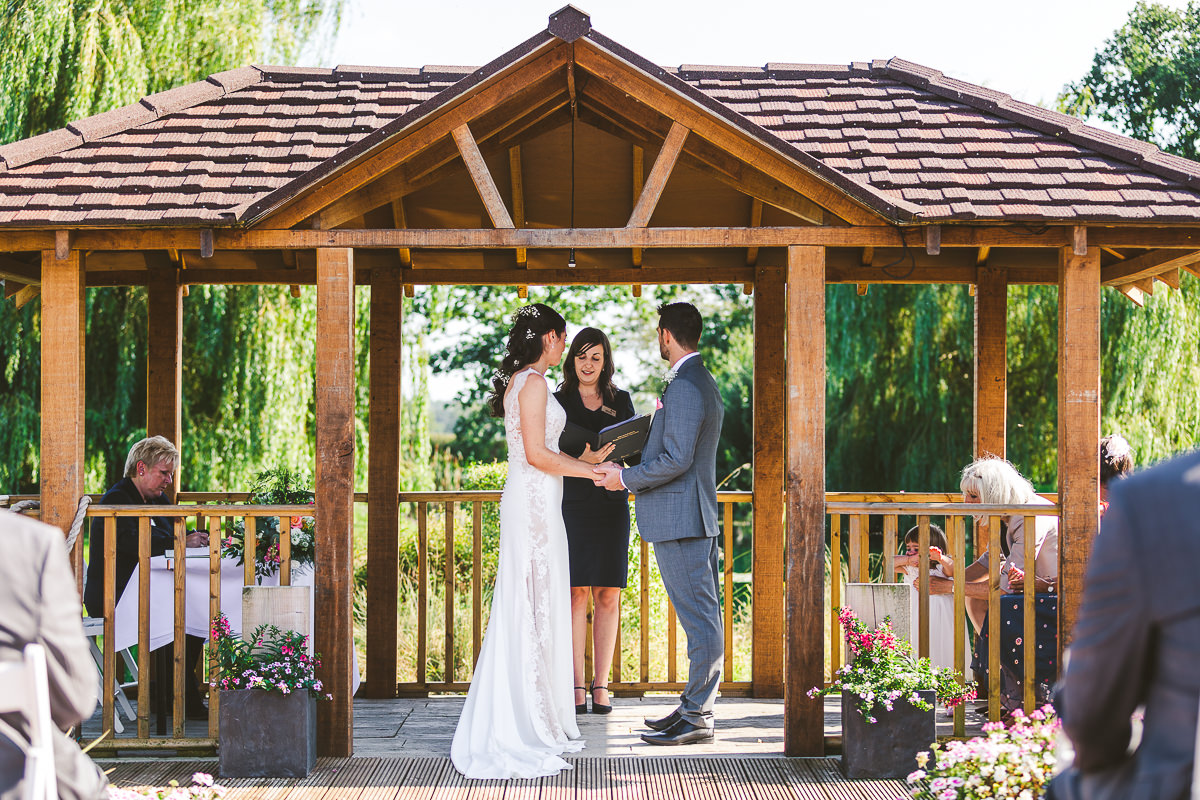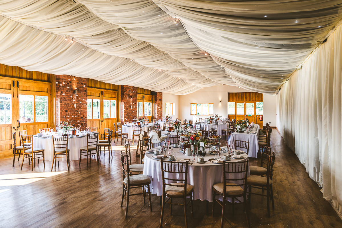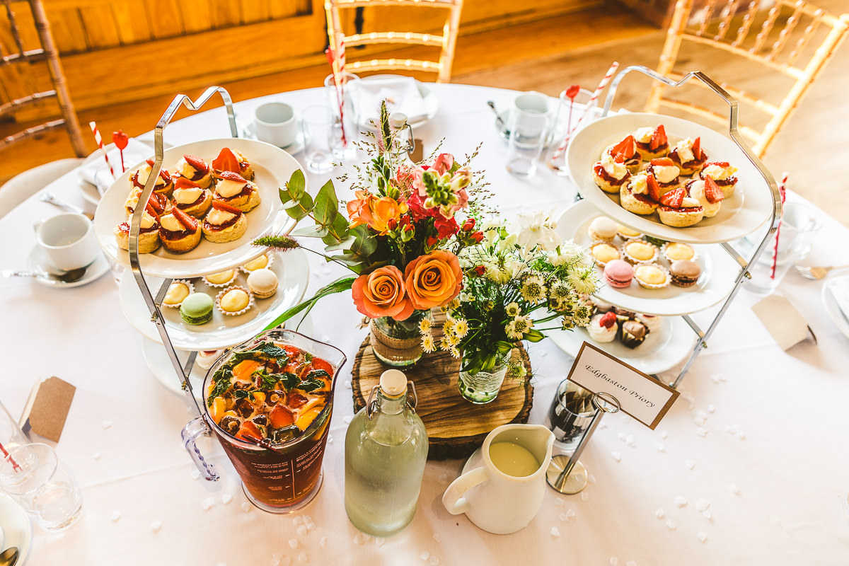 The ceremony took place outside by the lake, making the most of the brilliant weather that we’ve been fortunate to have this summer. It was a wonderful affair conducted in front of the bride and groom’s closest friends and family. With the rings exchanged and the confetti thrown everyone made their way back to the barns for the drinks reception which was followed by a stunning high tea wedding breakfast.